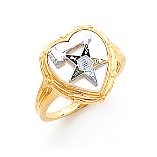 14k yellow gold past matron ring has a heart shaped top made of mother of pearl. Finely detailed ring features enamel Order of the Eastern Star logo. Made in the USA.