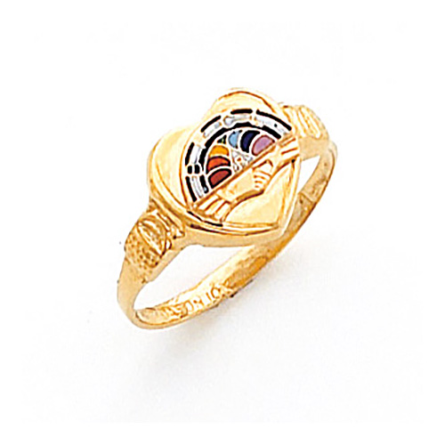 Heart shaped rainbow girl ring is made of polished 10k yellow gold. Rainbow enamel top. Open back. Standard fit. Made in USA. Rainbow is a non-profit, service-oriented organization that teaches girls three basic virtues: Faith in a Supreme Being and other people, having Hope in all that they do, and Charity toward others.