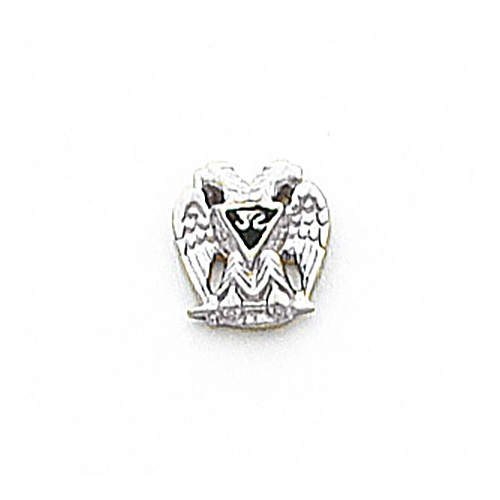 This Scottish Rite double eagle 32nd degree tie tac is made of 10kt white gold. This item measures 3/8 inch tall and 3/8 inch wide. Black enamel. The double-headed eagle symbol is for the Ancient and Accepted Scottish Rite of Freemasonry. The number 32 represents the 32nd degree of the Scottish Rite. Made in the USA.