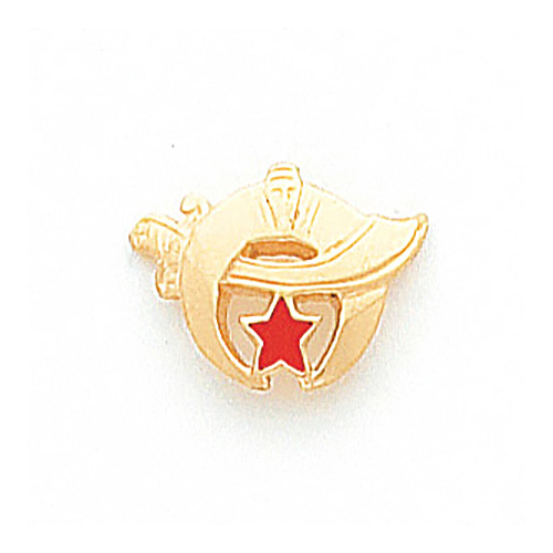 Polished 10k yellow gold. This item measures 7/16 inch tall and 5/8 inch wide. The sword and crescent are symbols for the Shriners: the Ancient Arabic Order, Nobles of the Mystic Shrine.