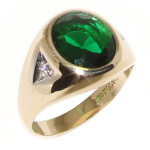 This large men's ring features an oval synthetic emerald. Two genuine diamond accents, 1/20 CT TW. Polished 10k yellow gold. Solid back, made in the USA.