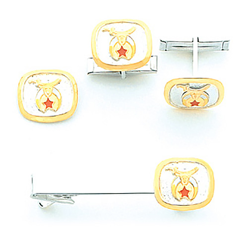 Polished, solid sterling silver set of cuff links, tie tac and tie bar. Finely detailed set features Shriners sword, crescent and red star logo. Tie tac dimensions: 5/8 inch tall x 11/16 inch wide. Cuff link dimensions: 9/16 inch tall x 11/16 inch wide. Tie bar: 5/8 inch tall and 2 inches wide.