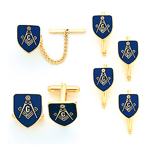 Shield shape, yellow gold plated set of cuff links, tie tac and shirt studs. Finely detailed set features Masonic compass and set square logo. Blue tone. Cuff links dimensions: 3/4 inch wide x 5/8 inch tall. Tie tac: 3/4 inch tall x 1/2 inch wide.