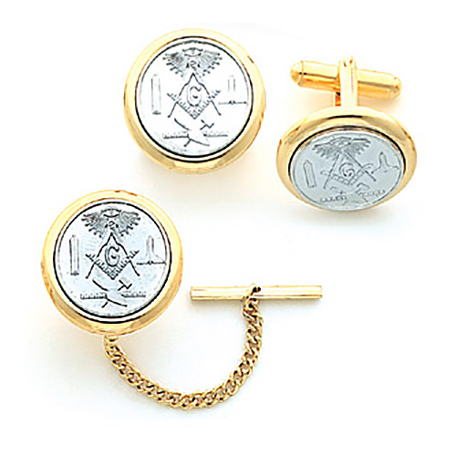 Two tone yellow gold plated set of masonic cuff links and tie bar. Detailed set features Masonic compass and set square logo. Round cuff links and tie bar measure 7/8 inch in diameter.