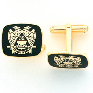 Oblong shape, yellow gold plated set of Scottish rite cuff links. Finely detailed set features Scottish Rite logo. Inscription reads: SPES MEA IN DEO EST (Latin: My Hope Is In God) Black tone. Cuff links dimensions: 5/8 inch wide x 3/4 inch tall.
