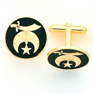 Round shape, yellow gold plated set of cuff links feature the Shriners logo. Black tone. Cuff links dimensions: 3/4 inch wide x 3/4 inch tall.