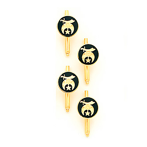 Round shape, yellow gold plated set of shirt studs. Finely detailed set features Shriners logo. Black tone. Dimensions: 3/8 inch diameter.
