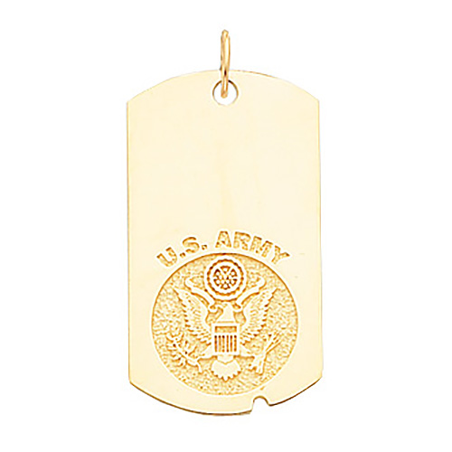 Polished 10k yellow gold. U.S. Army dog tag features Eagle insignia. Dimensions: 1 5/8 inch tall and 1 inch wide.