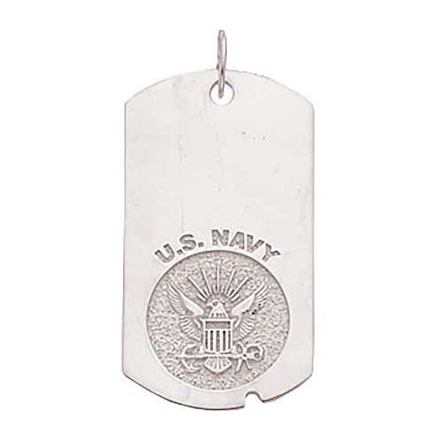 Polished sterling silver. U.S. Navy dog tag features Eagle insignia. Dimensions: 1 5/8 inch tall and 1 inch wide.