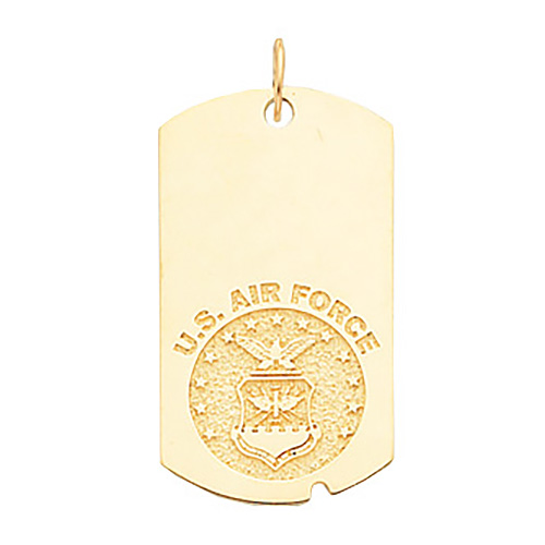 Polished solid 10k yellow gold U.S. Air Force dog tag features eagle and shield insignia. Dimensions: 1 5/8 inch tall and 1 inch wide. Fits up to a 3mm wide chain. Made in USA.