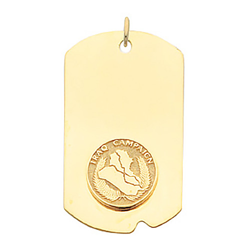 Polished yellow gold plated. Iraq Campaign dog tag features country map with laurel leaves. Dimensions: 2 inches tall and 1 1/8 inch wide.