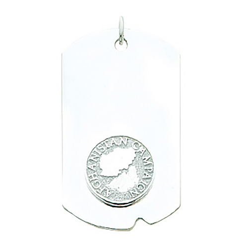 Polished sterling silver. Afghanistan Campaign dog tag features country map with laurel leaves. Dimensions: 2 inches tall and 1 1/8 inch wide.