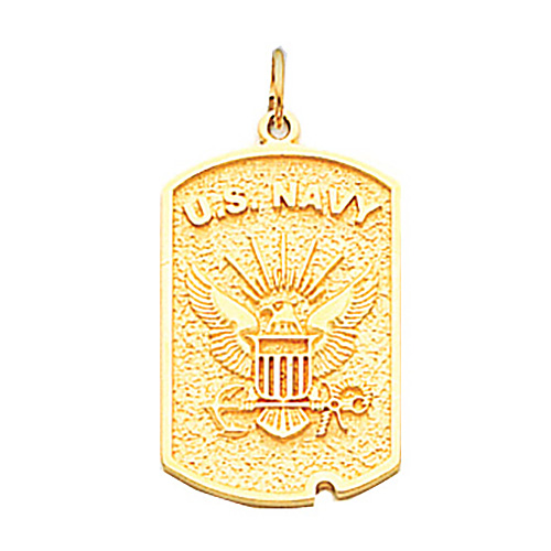 Polished solid 14k yellow gold US Navy dog tag features Navy Eagle insignia. Dimensions: 1 inch tall and 3/4 inch wide. Fits up to a 3mm wide chain. Made in USA.