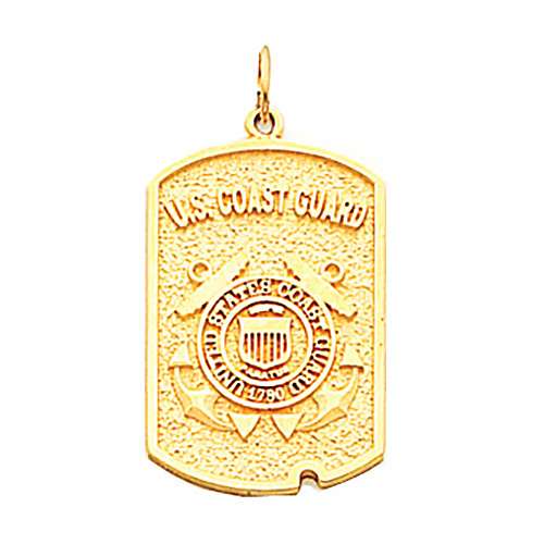 Polished 14k yellow gold. U.S. Coast Guard dog tag features double anchor and USCG seal insignia. Dimensions: 1 inch tall and 3/4 inch wide.