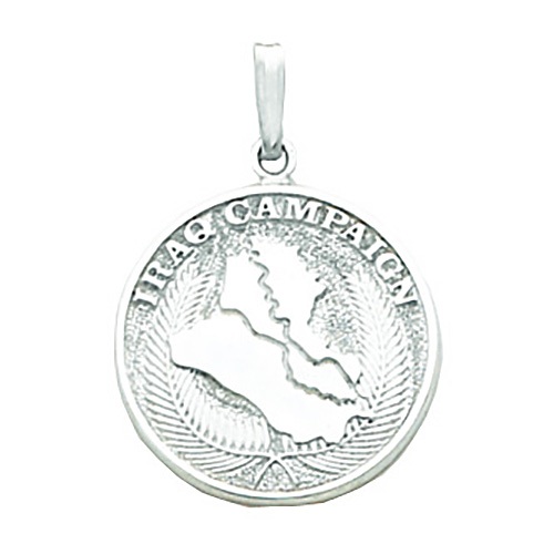 This round Iraq campaign medal is made of polished sterling silver. Item is 7/8 inch in diameter, slightly larger than a nickel. Inscription: IRAQ CAMPAIGN with Iraq country map and laurel leaves.
