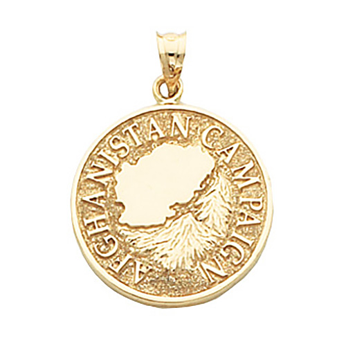 This round Afghanistan campaign medal is made of gold-filled sterling silver. Item is 7/8 inch in diameter, slightly larger than a nickel. Inscription: AFGHANISTAN CAMPAIGN with country map and mountain tops. Made in USA.