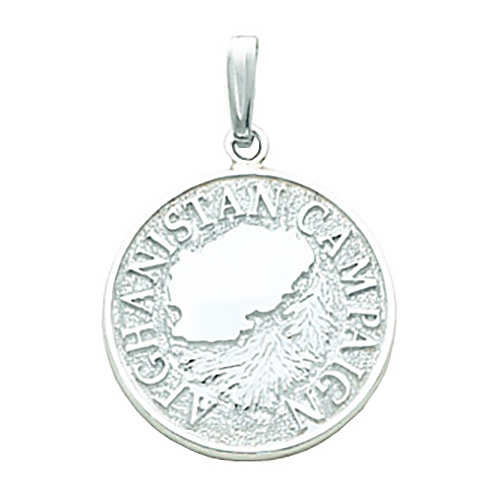 Polished sterling silver medal. Item measures 7/8 inch in diameter, slightly larger than a nickel. Inscription: AFGHANISTAN CAMPAIGN with country map and mountain tops.