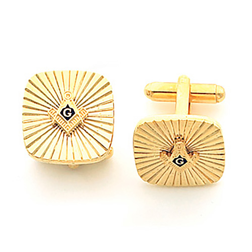 Yellow gold plated set of sunburst masonic cuff links. Sturdy yet finely detailed set features Masonic compass and set square logo. Blue tone. Cuff links dimensions: 3/4 x 3/4 inch. Celebrate your brotherhood with this exquisite sunburst design.