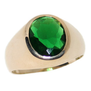 This men's ring features a 9mm round synthetic emerald. Polished 10k yellow gold. Open back, made in the USA.