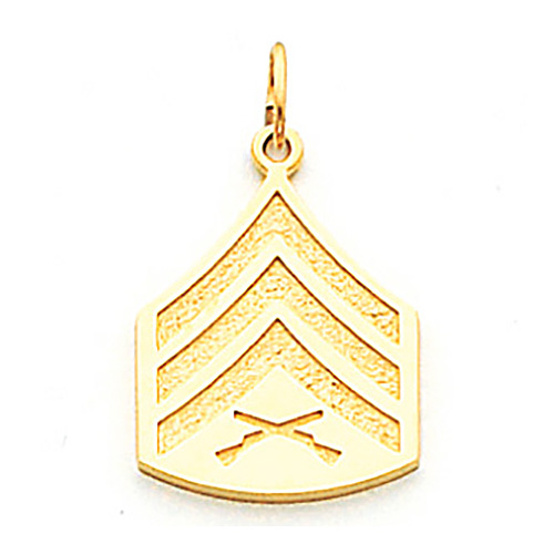 US Marine Corps Sergeant insignia pendant is made of polished 14k yellow gold. Dimensions: 3/4 inch tall and 5/8 inch wide. Officially licensed product of the USMC. Made in USA.