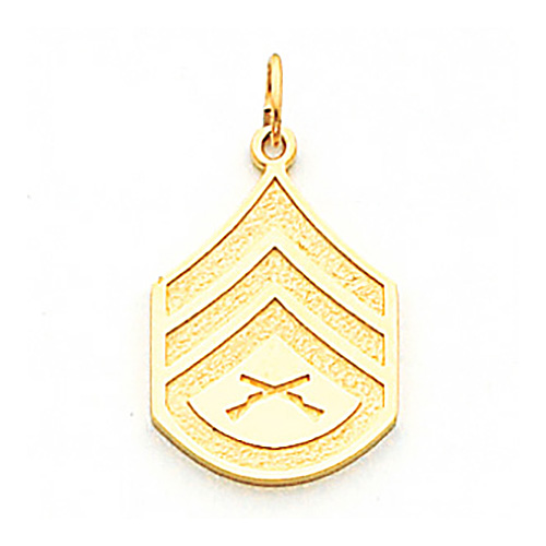 US Marine Corps staff sergeant insignia pendant is made of polished 14k yellow gold. Dimensions: 7/8 inch tall and 5/8 inch wide. Chain not included. Officially licensed product of the USMC.