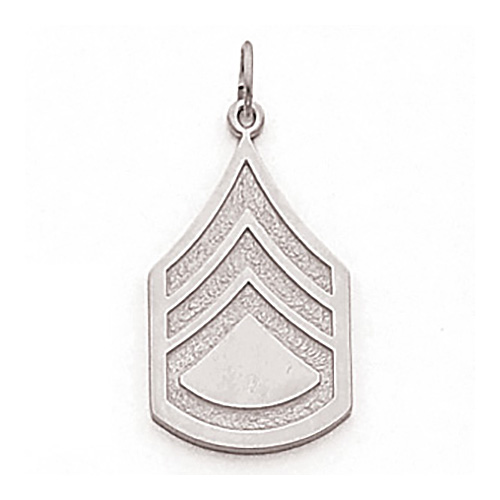 US Army staff sergeant insignia pendant is made of sterling silver. Dimensions: 1 inch tall and 5/8 inch wide. Chain not included.