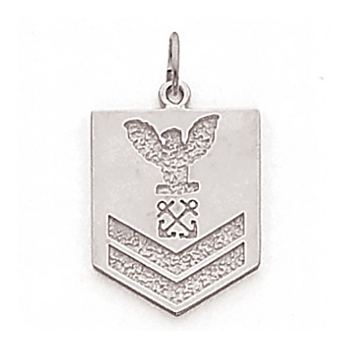 Polished sterling silver. US Navy Petty Officer Second Class insignia. Dimensions: 3/4 inch tall and 5/8 inch wide. This item is the size of a penny. Chain not included.