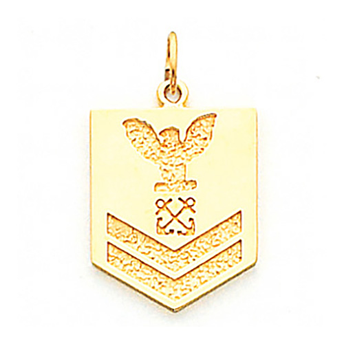 Polished 14k yellow gold. US Navy Petty Officer Second Class insignia. Dimensions: 3/4 inch tall and 5/8 inch wide. Chain not included.