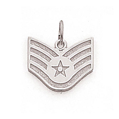US Air Force staff sergeant insignia pendant is made of solid sterling silver. Dimensions: 1/2 inch tall and 5/8 inch wide. Chain not included. Made in USA.