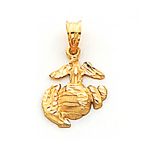 Polished 14k yellow gold United States Marine Corps pendant features Eagle, Globe and Anchor. Dimensions: 1/2 inch tall and 1/2 inch wide. Chain not included.