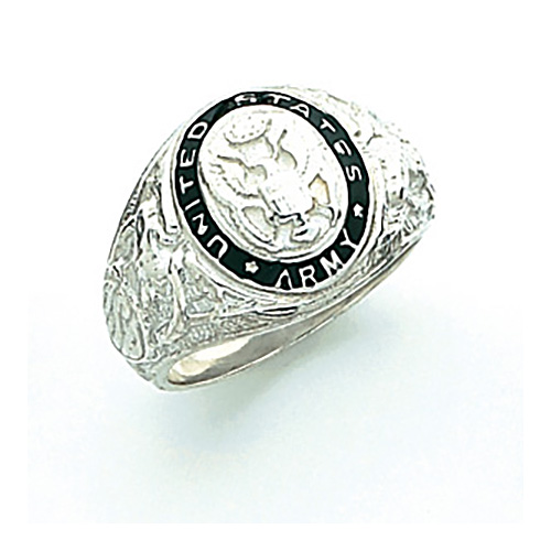 Polished sterling silver, open back army ring. Each ring is hand made to order in the USA. Wording around the stone: UNITED STATES ARMY. Black enamel finish. Eagle top. Available in finger sizes 8-14, whole and half sizes only.