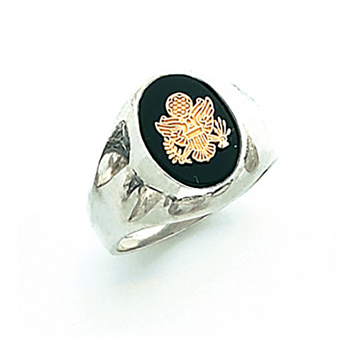 Polished sterling silver US Army ring has a genuine black onyx stone with gold army eagle emblem. Each solid back ring is hand made to order in the USA. Available in finger sizes 8-14, whole and half sizes only.