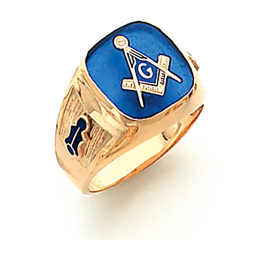 Gold-plated sterling silver masonic ring offers your choice of a red, blue or black onyx oblong stone. G, compass and set square logo is encrusted on top of the stone. Plumb bob and trowel enamel side emblems. Stone dimensions: 12mm x 12mm. Solid back. Approximate weight of a size 10 ring: 13.1 grams. Made in the USA.
