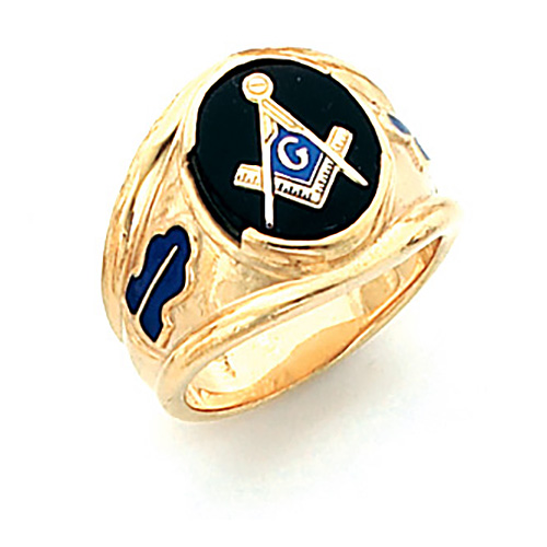 Gold plated sterling silver large masonic ring has an oval stone and blue enamel side emblems. Choose red, blue or black onyx oval stone. Stone size: 14mm x 12mm. Blue Lodge set square and compass logo. Plumb bob and trowel enamel side emblems. Solid back. Standard fit. Made in the USA.