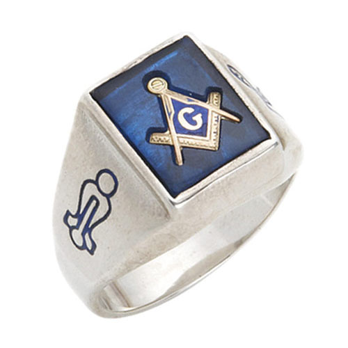 Solid back, sterling silver masonic ring features outlined plumb bob and trowel enamel side emblems. Choose red, blue or black onyx rectangular stone. Anti-tarnish sterlite. Blue Lodge set square and compass logo. Made in the USA.