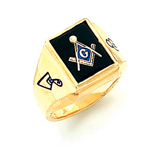 Gold-plated sterling silver masonic ring features outlined plumb bob and trowel enamel side emblems. Choose red, blue or black onyx rectangular stone. Solid back. Blue Lodge set square and compass logo. Made in the USA.