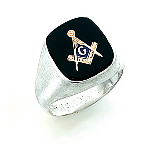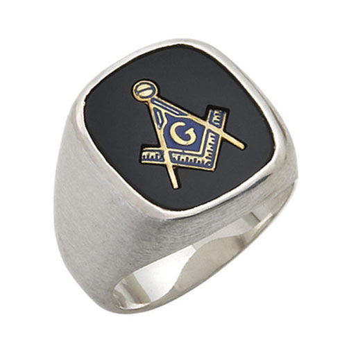 This jumbo sterling silver masonic ring has brushed blank sides. Choose red, blue or black onyx oblong stone. Stone size: 15mm x 15mm. Blue Lodge set square and compass logo. Solid back. Made in the USA.
