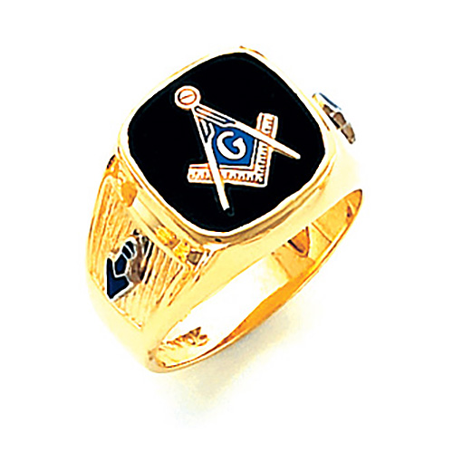 Polished sold 10k yellow gold ring with Masonic compass and set square symbol. Choose red, blue or onyx oblong stone. Choose two blue enamel side emblems. Wide shank. Choose open or solid back. Pictured with plumb bob and trowel side emblems.