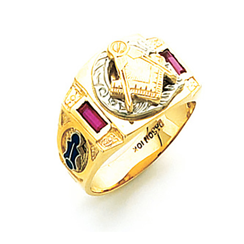 Solid back, polished 14k yellow gold ring with Masonic compass and set square symbol. Past Master insignia. Synthetic blue sapphire baguettes. Choose two blue enamel side emblems. Pictured with plumb bob and trowel side emblems.