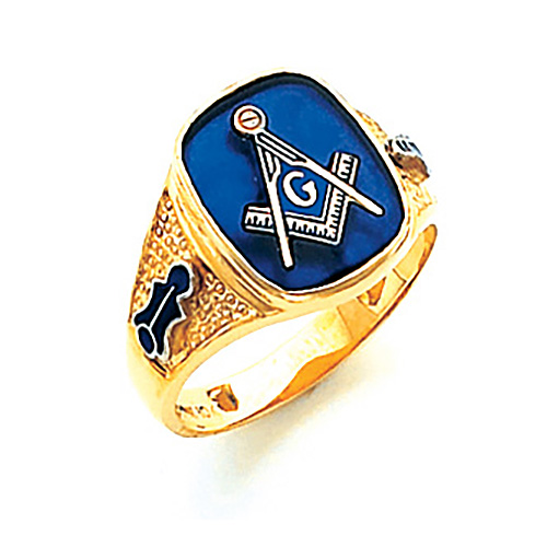 Polished 14k yellow gold masonic ring with G, square and compasses symbol offers your choice of side emblems and stone color. Pebble grain shank. Choose red, blue or onyx oblong stone. Stone size: 14mm x 11mm. Tapered shank. Pictured with plumb bob and trowel side emblems. Size 10, solid back ring weighs approximately 15 grams. Made in the USA.