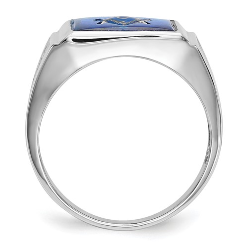 This 14k white gold blue lodge ring has a rectangular synthetic blue spinel stone with Masonic compass and set square symbol. Open back ring has tapered sides. Plumb bob and trowel side emblems. Stone size: 12mm x 10mm. Open back. Item weighs approximately 6.8 grams. Made in USA.