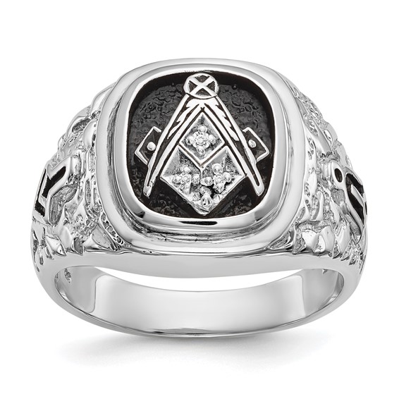 Black onyx stone. Solid back, polished 14k white gold ring with Masonic compass and set square symbol. Four diamond accents, .02 CT TW. Tapered sides. Plumb bob and trowel side emblems. Item weighs approximately 12.9 grams.
