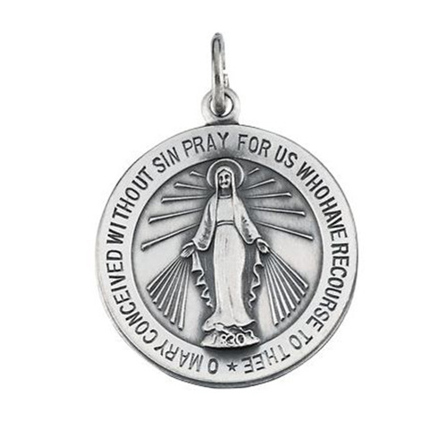 Antiqued sterling silver miraculous medal is approximately the size of a nickel. Inscription: O MARY CONCEIVED WITHOUT SIN PRAY FOR US WHO HAVE RECOURSE TO THEE. Weighs 3.56 grams. Please note: weight is approximate, actual weight may vary. Chain not included.