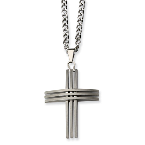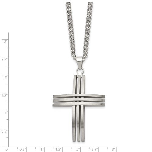 This men's brushed stainless steel cross hangs from a 24-inch stainless steel cable chain with fancy lobster clasp. This cross is 1 1/2in wide and 1 7/8 inch in length. Imported.