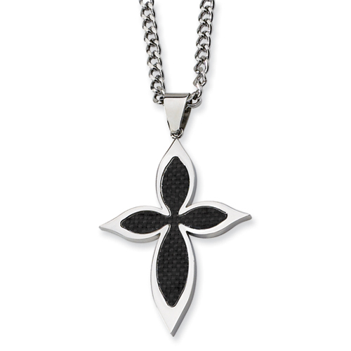 Black carbon fiber pointed cross pendant is made of stainless steel. Item size: 1 1/2in wide and 2in in length. Free 24-inch stainless steel cable chain, fancy lobster clasp. Imported.