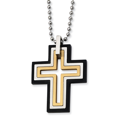 Black and gold plated finish. This polished stainless steel cross is 1 1/4in wide and 1 1/2 inch in length. 22-inch stainless steel bead chain, fancy lobster clasp. Imported. Available while supplies last.