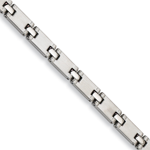 This men's stainless steel bracelet has flat brushed rectangular links. Small polished links and fold-over clasp. 1/4in wide links, bracelet is 8 1/2 inches in length. This bracelet is composed of grade 316 stainless steel. Stainless steel will not oxidize [rust] nor turn black. Imported.