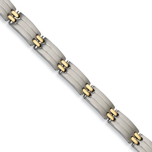 Polished 24k gold-plated links, brushed steel finish. 5/16in wide links, bracelet is 8 3/4 inches in length. Fold-over catch: this catch features a slotted bar and a folding device that locks around it for extra security. This bracelet is composed of grade 316 stainless steel, known for its superior corrosion resistance. 316 steel is commonly used in stainless steel jewelry. Insist on 316 stainless steel. 316 stainless steel is also known as marine grade stainless steel, for its high resistance to chloride corrosion. Stainless steel will not oxidize [rust] nor turn black. Imported.