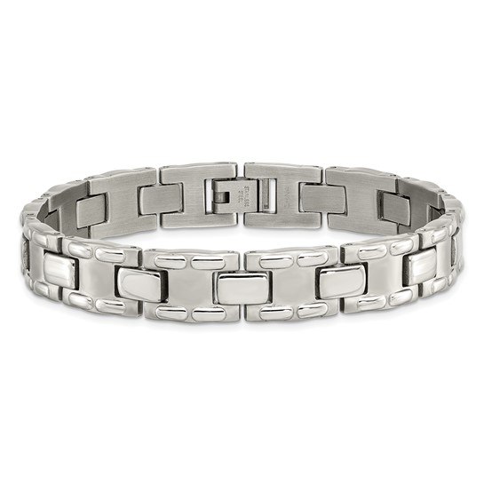 This men's stainless steel bracelet has links with raised accents in the corners and a fold-over clasp. Brushed and polished. Link width: 7/16in, bracelet length: 8 3/4in. This bracelet is composed of grade 316 stainless steel, known for its superior corrosion resistance. 316 steel is commonly used in stainless steel jewelry. Insist on 316 stainless steel. 316 stainless steel is also known as marine grade stainless steel, for its high resistance to chloride corrosion. Stainless steel will not oxidize [rust] nor turn black. Imported.