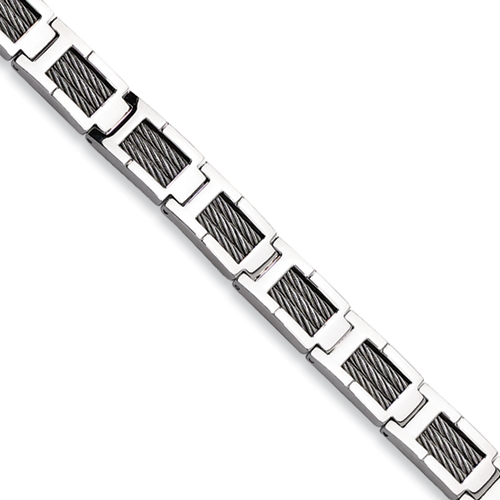 Graby cable, brushed and polished finish. 7/16in wide links, bracelet is 8 1/2 inches in length. Fold-over catch: this catch features a slotted bar and a folding device that locks around it for extra security. This bracelet is composed of grade 316 stainless steel, known for its superior corrosion resistance. 316 steel is commonly used in stainless steel jewelry. Insist on 316 stainless steel. 316 stainless steel is also known as marine grade stainless steel, for its high resistance to chloride corrosion. Stainless steel will not oxidize [rust] nor turn black. Imported.